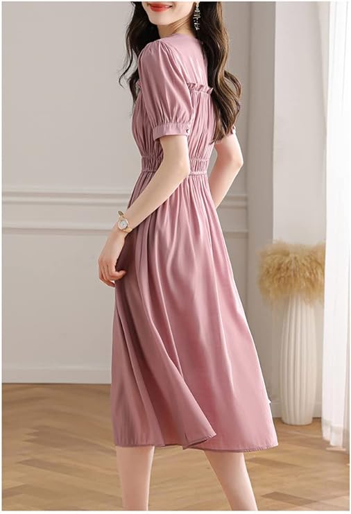 • French pink pleated dress, temperament, age-reducing, waist-slimming, medium-length skirt